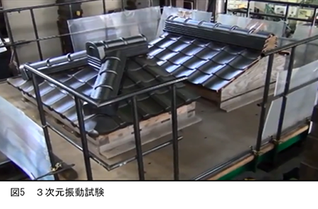 (2)振動台試験  3次元振動試験装置を用い、実際の地震に近い揺れを棟部にかける試験を行いました(図5)。この試験では、兵庫県南部地震(阪神・淡路大震災)JR鷹取駅の震度7地点と同等の振動をかけても異常がありませんでした。