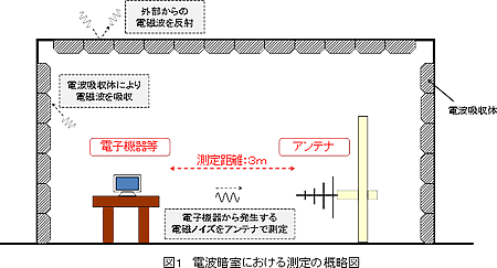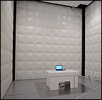 EMCに関する試験は電波暗室という特殊な環境の部屋で行います。一般的な部屋の環境においては、ラジオをはじめ携帯電話や地上デジタル放送など様々な電波が飛び交っており、また、壁などで電磁波が反射して干渉するので、正しい評価ができないためです。かつてはオープンサイトと呼ばれる屋外の測定設備で測定が行われておりましたが、最近では電波暗室で行うことが主流です。電波暗室の外側は金属などの導電性の材料で遮へいすることで外部からの電磁波の影響を受けず、内部からも電磁波が漏れないようになっています。また、内側は電磁波が壁や天井で反射しないように電磁波吸収体で覆い、床面は金属で電磁波が反射するようになっており、無限の大地の状態を模擬しています。電磁波吸収体には、ウレタンや発泡スチロールに炭素粒子を混ぜ込んで導電性を持たせたものやフェライトを材料としたものが使われます。