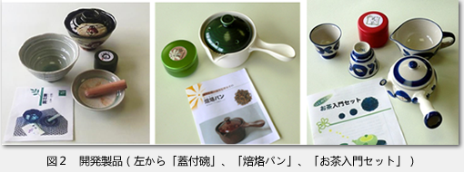 開発した製品は、「碾茶を食べる:愛知ならではの健康食」「ほうじ茶の手作りとレシピの楽しみ」「世代を繋ぐ交流:お茶文化伝承」を提案するもので、@生産量と品質を誇る愛知の碾茶をご飯にかけて味わうための器:蓋がすり鉢になりお茶の香りが楽しめる「蓋付碗」、Aほうじ茶やほうじ茶のチャイの手作りを楽しむための耐熱小鍋「焙烙パン」、B子供や若い世代のための本格的な茶器揃え「お茶入門セット」の3製品(図2)です。いずれもお茶関連分野の現状、課題、ニーズ、提案等を踏まえ、瀬戸焼の技術や素材を活かして開発した製品で、それぞれに高品質な県産茶、レシピ等具体的な楽しみ方を記した説明書をパッケージ化して、購入してすぐに味わい、楽しむことができる商品としました。