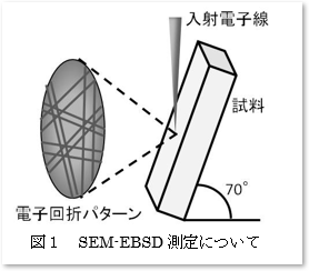 走査電子顕微鏡(SEM)は、細く絞った電子線で試料表面を走査し、ミクロ〜ナノスケールでの表面構造の観察や、エネルギー分散型X線検出器(EDS)による元素分析を主な用途として、製品開発や品質管理に広く利用されています。 SEM-EBSD測定では、試料を70°程度に傾斜して電子線を照射し、試料表面から発生する後方散乱電子回折パターンを専用の検出器で検出します(図1)。このパターンについて、結晶方位解析を行うと、試料の結晶粒観察や結晶方位分布などが得られます。