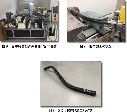 熱硬化性樹脂は成形後に曲げ等の変形をさせることはできませんが、熱可塑性樹脂は成形後に再加熱することで、樹脂を溶融・軟化し変形させることができます。そこで、フィラメントワインディング法でCFRTPパイプを作製した後、加熱装置付き自動曲げ加工装置を用いてCFRTPパイプの曲げ加工に取り組みました。曲げ加工は、CFRTPパイプを図6に示す曲げ加工装置に取り付け、加工部を再加熱した後、パイプに引張変位を与えながら金型に押し当てて行います(図7)。CFRTPパイプの曲げ加工においては、パイプ断面の変形や座屈などが問題になります。これらの課題を解決するため、本研究で開発した芯材をパイプの内部に挿入し、引張量を最適化することで加工後のパイプ断面の変形量を抑制することに成功しました。また、パイプの両端部を曲げ加工することでU字型、S字型および3D形状の曲げ加工を行うことが可能になりました(図8)。