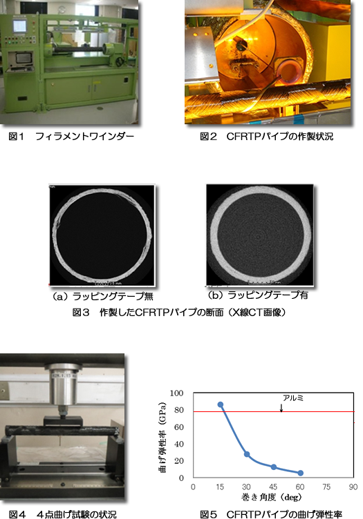 フィラメントワインダーを使用することでCFRTPパイプが容易に作製でき、曲げ加工技術を活用することで複雑形状のCFRTP中空部材の作製が可能になりました。