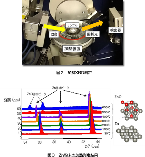 加熱XRD測定について図2に示します。測定サンプルを加熱装置の窒化アルミ製のステージに載せてヒーターにより加熱しながらXRD測定を行います。本装置では最大1100℃まで測定を行うことができます。図3に亜鉛(Zn)粉末を室温〜600℃まで加熱測定した結果を示します。亜鉛粉末の加熱温度が高くなるほど、亜鉛の回折ピーク位置が低角側にシフトしたことがわかります。これは熱膨張により結晶の格子が長くなったことを意味します。さらに亜鉛のそれぞれの回折ピーク位置のシフト量が異なることから、加熱により膨張しやすい方向があることもわかりました。また400〜500℃の間で回折ピーク位置に変化が見られ、回折ピーク位置による物質の特定を行ったところ、酸化亜鉛が徐々に生成されていることもわかりました。このように「その場測定」を行うことにより反応の途中経過を知ることができます。