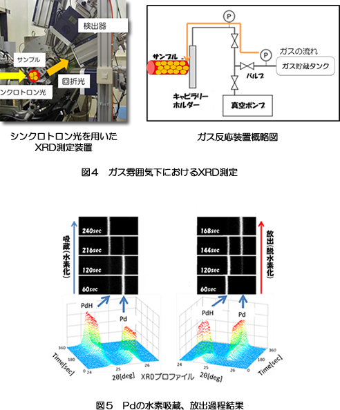 ガス雰囲気下におけるXRD測定について図4に示します。図4(右)はガス反応装置の概略図になります。バルブを開放することでサンプルにガスを吸蔵、ポンプで排気することでガスを放出する仕組みです。このガス反応装置をXRD装置に組み付けることでガス雰囲気下におけるXRD測定を行います。本測定では入射光としてシンクロトロン光を使用しました。シンクロトロン光は、実験室で使用されるX線と同じく電磁波の一種ですが、極めて強度の高い光であるため、数秒という短い時間でも質の良いデータを得ることができます。この特徴は物質の変化の過程を追う、「その場測定」に適した光と言えます。今回の測定サンプルには金属パラジウム(Pd)微粉末を用いました。Pdは自動車排ガス用触媒や水素吸蔵合金などに多く利用される金属であり、水素ガスを流すと水素化パラジウム(PdH)として水素を吸蔵します。そのPdの水素吸蔵過程を捉えるために、Pdに水素ガスを流しながら起こる変化について1秒ごとにXRD測定しました。その結果のまとめが図5になります。水素を吸蔵させるとPdの回折ピークが徐々に減少することと、新たにPdHの回折ピークが成長していく水素吸蔵の過程が「同時」に起きていることがわかりました。また水素放出では吸蔵とは逆に脱水素化していく変化の過程も捉えることができました。