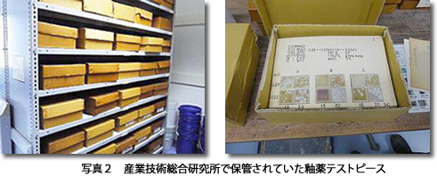 国立研究開発法人産業技術総合研究所(産総研)中部センターにおいて脈々と引き継がれてきた陶磁器研究・釉薬研究ですが、平成30年、多くの成果を残し終了することとなりました。 長年に亘る陶磁器研究・釉薬研究の過程で作製された釉薬テストピースは、約30万点に及びました。これらは研究の成果としてテーマごとに作製されたもので、適切な調合や温度で焼かれたものばかりでなく、白濁したもの、結晶が出たもの、溶けきっていないものなど様々な状態のテストピースが一枚のボードに20枚ほど貼付されており、釉薬開発・釉薬研究には非常に有効な資料であり、貴重なものであると言えます。
