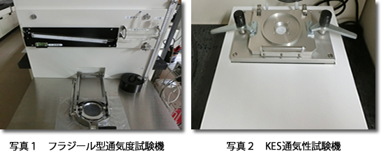当センターには、フラジール型通気度試験機とKES 通気性試験機があります。フラジール型通気度試験機は、JIS L 1096「織物及び編物の生地試験方法」などに規定され、一般に広く採用されている試験機で、圧力一定の条件下で生地を通過する空気量を測定します。KES 通気性試験機は、厚みのあるサンプルや極めて通気性の低いサンプルの測定にも対応できる試験機で、通気量一定の条件下で通気抵抗を測定します。