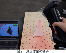 本機で3Dスキャンを行うには測定準備として、位置情報を取得するためのポジショニングターゲットと呼ばれる小さな丸いシールを測定物または背景に貼り付けていく作業が必要です。スキャン作業では、レーザーを対象物に照射して測定を開始すると同時に、PCモニタ上に点群データが反映されていくため、進捗状況を確認しながら測定を進めることができます(図2)。このように、3Dスキャナを用いると比較的簡単に対象物の形状データを取得することができますが、対象物の材質や形状によっては測定に注意が必要です。