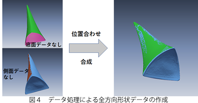 材質の他に、対象物の形状も測定の可否や難度に影響します。本方式では測定にレーザー光を用いますので、もちろんレーザー光の当たらない陰の部分はデータの取得ができません。そのため、何らかの方法で対象物を宙に浮かした状態で、スキャナ本体を回り込ませて測定することが有効です。また、対象物の配置方向を変化させ、それぞれの配置で取得した複数の形状データを合成することもできます。図4では対象物の配置方向を変更し、それぞれで取得したデータを編集ソフトウェア(Geomagic XOS, 3DSystems社)を用いて合成することで底面を含む全方向データを取得しています。