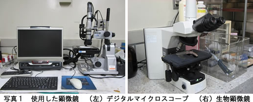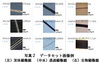 100回の学習により学習データでの自己評価エラーは0に近く、学習効果は十分と考えられました。しかし、実体顕微鏡画像では評価データでの自己評価エラーが非常に高く、その結果全正答率は0.398と低くなりました。これに対して、透過顕微鏡画像では全正答率が0.650、毛種類ごとの種類判別結果もヤギのRecallを除きすべて実体顕微鏡画像を上回りました(図1)。表面構造は実体顕微鏡画像の方が鮮明です(写真2)。これより、判別には表面構造などの細部よりも、毛部分と背景との色差による毛部分全体の違いが認識できることが重要と考えられました。生物顕微鏡は透過像を観察する点において透過顕微鏡画像と等価と考えられます。しかし、生物顕微鏡画像を用いて判別を行った結果、全正答率が0.494と透過顕微鏡画像と比べて低くなりました。これは画像撮影時の光学条件の違いによる画像の色合いの違いが影響していると考えられ、顕微鏡間のデータ統合のためには正答率が高くなる光学条件の検証が必要です。