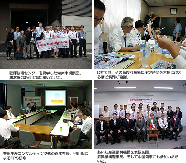 第2回のレポートで計画中とお伝えした「常州市熱処理業協会」所属企業の招聘が、8月4日〜10日の一週間の日程で実現しました。常州市熱処理業協会は、2006年に発足した比較的新しい業界団体で、常州市に60ある工業系業界団体の内の一つ。会員企業には大小合わせて約70の企業が名を連ねています。「第1回常州市企業団愛知技術研修」と銘打ってAARI主催で開催された今回の視察旅行には、常州市熱処理業協会の会長を含む20代から70代までの10名が参加しました。規模の大小はあっても、殆どが常州市内で熱処理メーカーを経営する企業オーナーです。
