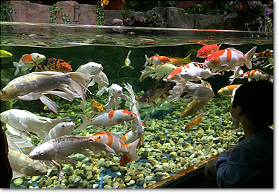 次に肝心のお魚ですが、まずは上の写真のように淡水魚が多く、それは別段問題ないにしても、とにかく水槽の中に入れる魚の数が多すぎます。写真の鯉などは、うじゃうじゃいる、といった印象です。美しいというよりも、感想はあくまでも「うじゃうじゃ」です。