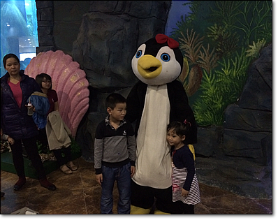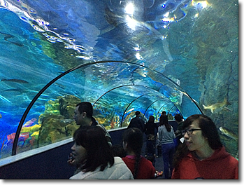 それから、最近の定番「トンネル水槽」もあって、これは結構距離が長くて「ホーッ」となるのですが、少々中に入れられている魚の色彩が地味です。そして何よりも、臭いが結構キツいです。何でも人工的に海水を作っているとのことですが、臭いのキツさに早く出たくなってしまうのは、日本人の私たちだけなのでしょうか?