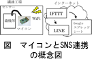 この例では、繊維工場の織機等にセンサーを取り付け、計測したデータをマイコンからIFTTT経由でLINEやGoogleスプレッドシートに送ることで、離れた場所からスマホなどで織機等の動作状態をモニタリングすることができます。