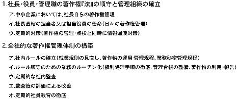 次に会社での著作権の管理(知的財産管理)には下記の体制を構築することをおすすめします。
