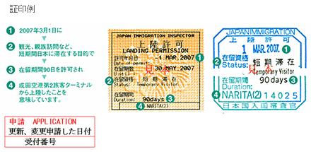 現在有効な証印の近くに「申請 APPLICATION」という上図(左下段)のようなスタンプが押されている場合は、現在、期間更新(E受付番号)又は資格変更(C受付番号)の申請中であり、まだ結果が出ていないという意味で、証印中の在留期限を経過していても不法残留にはなりません。永住(P受付番号)申請中の場合は、現在の在留期限までに許可されないと不法残留になりますので気をつけてください。