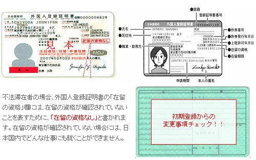 外国人を適法に雇用するには、その外国人の「在留資格」「在留期間」等を、旅券(パスポート)、外国人登録証明書、就労資格証明書、資格外活動許可書等で確認するようにしてください。就労資格の無い外国人を雇用した場合、トラブルに巻き込まれたり、不法就労助長罪として雇用主自身に罰則が科せられる可能性があります。