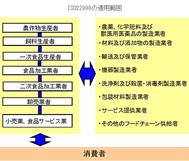 HACCPでも対象となっていたフードチェーンに直接的に関わる組織(農産物生産者、飼料生産者、食品製造・加工業、卸売業、小売業)のみならず、間接的に関わる組織(製造・包装機械メーカー、包装材料メーカー、流通業者などのサプライチェーンなど)も対象とすることで、フードチェーン全体における食品安全性の確保を目指します。