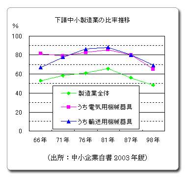 上掲グラフのとおり、80年代から90年代、下請中小製造業は、一貫して減少しています。 中小企業白書<2003年版>では、大手生産拠点の海外移転および大手自身の経営不振がその背景にあると指摘し、今後も減少傾向は、進むと予測していました。 このことに考察を加えて言えば、今後も下請仕事総量が減少する要因は、以下の二点にまとめられます。