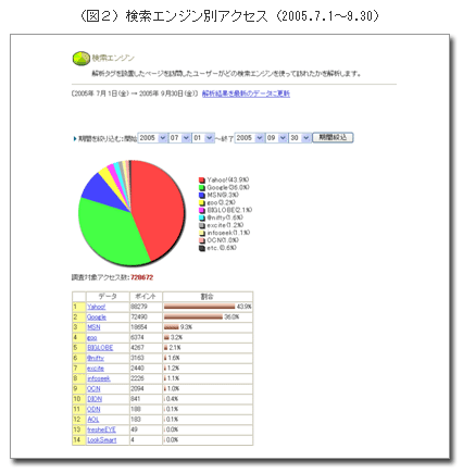 次に、検索エンジン別のアクセスです。(図2)をご覧下さい。これは現在も傾向として変わっていませんが、YahooとGoogleの二強時代が続いています。それぞれ検索表示の仕組みが違うので、SEO(検索エンジン最適化)の対策も簡単ではありません。Googleについては、