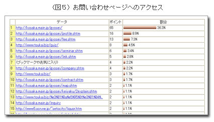 (図5)をご覧下さい。どのページからお問い合わせページへ訪問したか、そのトップ5は、@小坂行政書士事務所トップページ、Aプロフィールページ、B小坂行政書士事務所報酬案内、C法律クイズ(私のサイト)、D講演ページです。上位3つは、どの業務を依頼したかったのか把握することが困難です。4番目の「法律クイズ」は、雑誌への寄稿やTV番組の監修依頼などにつながっていますが、単に知識欲を満たすために質問をしてみたかっただけかもしれません。
