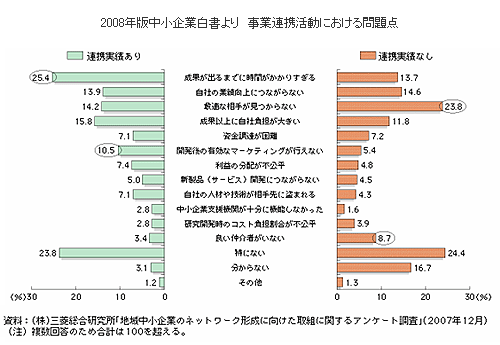 中小企業のネットワーク化については、「中小企業白書2008年版 第3部地域経済と中小企業の活性化 第3章新たな連携やネットワークの形成に取り組む中小企業」で中小企業のネットワーク化の現状と課題をとりあげており、「経営資源に限りのある中小企業が持続的に成長していくために一層重要になっている」としています。