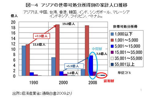 また、2010年通商白書によれば、2020年には、アジアの中間層は20億人に、富裕層は3.3億人(内:日本は1億人)に拡大すると推定されています。