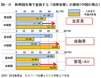 既に海外に事業展開している企業が「今後5年先を見据えて重視する消費者層」のアンケート調査結果を「ものづくり白書2009(経済産業省調べ)」から見たものが図−8です。