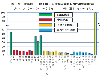 現状におけるアジア新興国の人件費レベルに関してジェトロが2009年に調査した各国の作業員(一般工職)の年間実負担額アンケートが公表されており図−9にこの値を見ることができます。