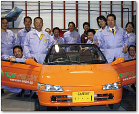 2010(平成22)年12月、手探りのなか試作に取りかかった。車種の選定、部材の発注、整備工場や製造経験者の手配、オリジナルカラーでの塗装、車体への組み込み。ここまでの工程をわずか2カ月で終え、完成後の実走行では全員歓喜に沸いた。その1カ月後、軽自動車として県内初となるコンバージョンEVでの車検取得に成功する。