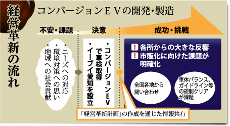 始まりは伊藤代表の3つの思いだった。自動車を通じてお客さまのニーズに応えたい、自動車に関わるものとして環境問題に貢献したい、そして中小企業の技術と知識を集結して地域に根付いた社会貢献をしたい。これらの思いが重なった時期に、既存のガソリン自動車を電気自動車に転換する「コンバージョンEV」の存在を知る。 「これなら自分たちの培ってきた技術と知識を発揮できるのではないか」(伊藤代表)