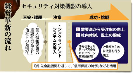 個人のPC端末に入っていた情報をファイルサーバで集中管理するシンクライアントシステムの導入を決意した。システム導入資金を検討する中、取引先の金融機関から「経営革新計画」に関する情報を得る。 2007(平成19)年に「経営革新計画」の承認を得る。「信用保証の特例」を活用して金融機関から融資を受け、シンクライアントのシステムを導入した。