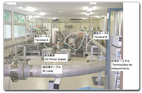 U字型のパイプの中は断熱の真空パイプ、その中にそれを冷やす液体窒素のパイプ、さらにその中に超伝導ケーブルが入っています。U字の真ん中には、真空や液体窒素のポンプ等や操作盤などが置かれています。U字の端には、電流を流し込む端末や電流の状態を計測する装置があります。これで、実際のシステムとしての送電状況やコスト効率を検証しようとしています。