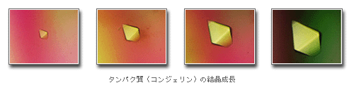 | 山根 結晶は、工業的にシリコンを作るときと同じように、タンパク質が溶けている溶液の中で、タネとなる小さな核から成長させます。この結晶を成長させるのが難しいのです。溶液の純度や温度だけではなく、重力による対流の影響も懸念されるので、宇宙での実験にも取組みました。この実験は、スペースシャトルの事故で残念な結果になってしまいましたが。 |