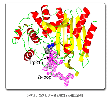 | 山根 化学合成では、LとDが50:50できてしまいます。Dだけを作り出すことが難しいのですね。いろいろな酵素をスクリーニングしてみた結果、D-アミノ酸を選択的に生産できる酵素が発見されました。私たちは、この酵素の構造や反応機構の解明を進めています。 |
