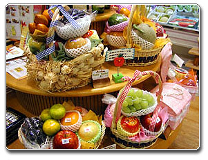売り場にメリハリを付け、お買得品、進物用品、高級果実と3段構えで訴求しています。旬鮮季節のコーナー、お買い得品を盛り込んだバケツ販売など、買いたいものがすぐ判るよう演出しています。