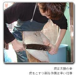 「胴の仕上がりと皮の作り方次第で、太鼓の命である音色が決まってしまいます」一切、手を緩める事のできない緊張する仕事です。