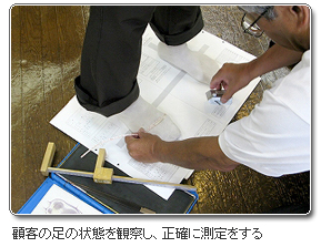 | お客さまの足、膝、腰の状態を観察し、足の長さ・幅などを正確に測定。