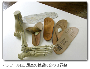 歩行の状態を観察し、足の形に合わせた木型(ラスト)、充分な余裕のある前足部、そして足のアーチを支え、快適な歩行をサポートする靴の製作、補正、調整と、インソール(コンフォート中敷)は足裏に合わせ製作します。