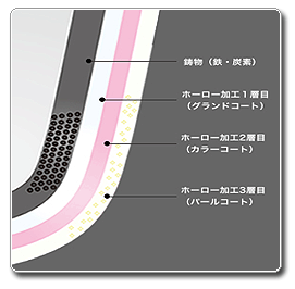 バーミキュラの製品では、本当に安全な物をお届けしたいという観点から、カドニュウム等の有害物質を含んだホーローを使用していません。従って赤や黄色を含むホーローを使用していないので色彩面ではカラフルさは出せませんが、パール加工という美しさとデザインにこだわりました。