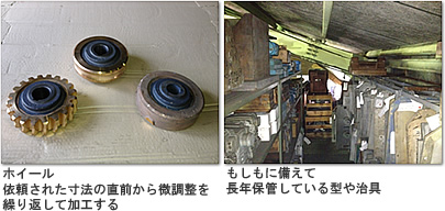 ウォームシャフトは旋盤→ねじ切り→熱処理→研磨の手順で、ウォームホイールは鋳造→旋盤→歯切の手順で作業します。30年以上のベテランが若手を部品の加工、製品の組立、設計・開発まで育成しながら技術・技能の伝承を行っています。その結果、突発な注文などにも一人で対応できるようにしています。また、2階には、過去に製造した製品の型や治具が大切に保管されています。 お客様はモーターが壊れたら諦めますが、減速機が壊れたら何とかしろ!と必ず云われます。その減速機が20年前、30年前の製品であっても…。実際、1950年〜1960年頃に出荷した製品の修理依頼が稀にあります。それに対応できる体制づくりが取られています。