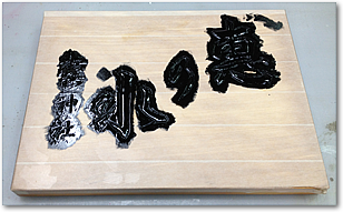 製作途中の看板は、する漆(一枚板に漆を叩いてしみこませた状態)をかけた状態です。この一枚板に版下を張り、手で削る作業に移ります。