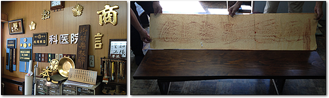 社屋の奥には木材を切る機械や通常の広告看板を製造する工場があります。入口には伝統工芸の雰囲気を醸し出す作業場があります。この作業場の壁に掲げているサンプルは全てオリジナルです。下地が網目になってそこに文字が掲げている看板(文字が浮いているように見える技法)、和風の門構えにピッタリな重厚な表札、木彫りした文字に金箔を貼った文字、金箔を貼った瓦等が掲げてあります。