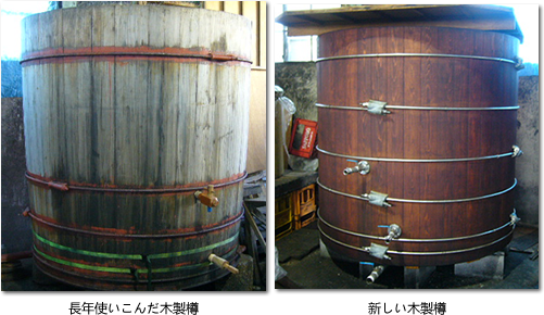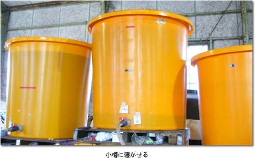 大釜で煮込み終えると、冷ましの工程へ移ります。60余年使用している木製大樽の出番です。大釜からソースを木製大樽へ移し替えます。木製大樽の強みは温度の下がり方が優しいことにあります。ステンレス等の金属釜は温度が上がるスピードも速いが冷めるスピードも速いです。 他方、木製大樽はジワリジワリと温度が下がります。100℃から25℃へのゆっくり温度が下がる工程にも味の秘訣があります。 そして更にソースを熟成させる次の木製大樽へ移し替えます。この樽は最近新しい樽に交換しました。そして最後は小樽へ移し替え、更に熟成させます。合計約4週間の熟成期間が味へのこだわりと差別化を産み出しています。