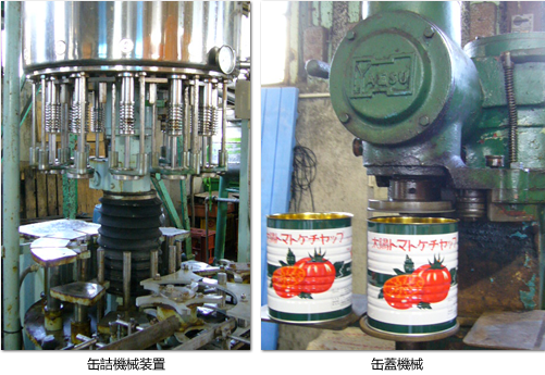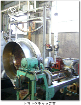 現在は愛知産のトマトでなく、トルコ産のトマトピューレを使っています。甘さのあるトマトケチャップを求めた結果、トルコ産トマトに行き着きました。釜にトマトピューレと水を入れ煮込みます。これに香辛料等を加えます。1個の釜で製造しているため、火加減やトマト状態等に職人の細かな気配りが届きます。火を止めて温度が下がったら瓶詰、缶詰工程に入ります。