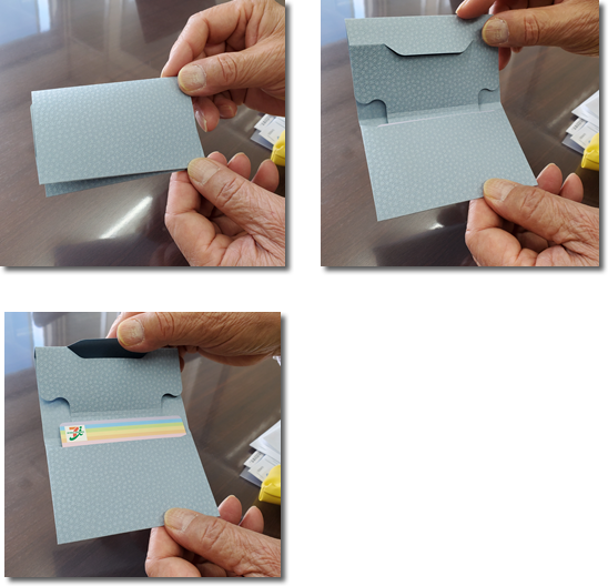 写真はセブンイレブンのナナコカードを代用して説明するカードケース(カードを開くと中にカードが入っています。上部の切り込みを引っ張ると中からカードが出てきます)
