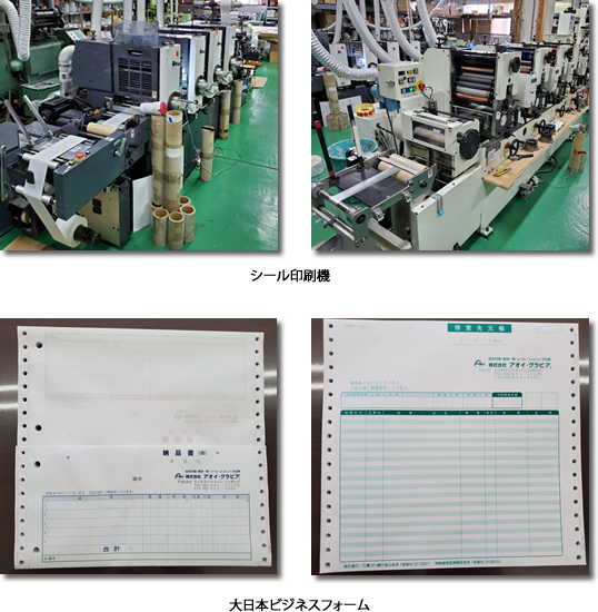工場内にはシール印刷を行う「有限会社 アオイシール」があります。また、名古屋市中川区にはビジネス伝票を製造する「株式会社 大日本ビジネスフォーム」もあります。写真は工場内にあるシール製造機械です。