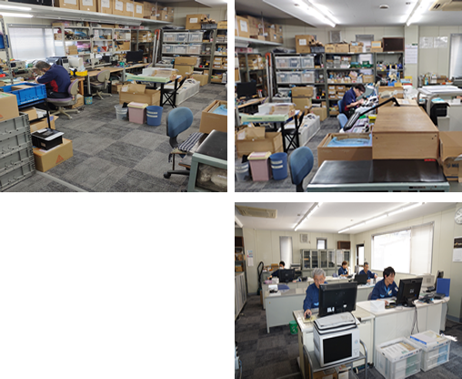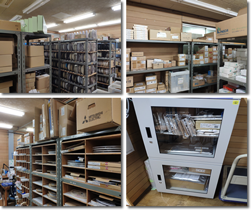 本社の横に在庫保管場所(旧本社の建物を活用)があります。中は小さな電子部品のリールが多数保管してあります。多数の複雑な電子回路のため、それに対応する手持ち在庫が必要なります。右下の写真にあるように湿度に弱い電子部品は防湿倉庫(湿度0%)に入れて管理しています。