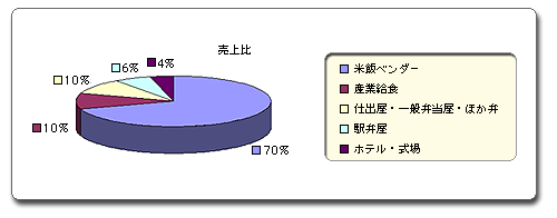 西春日井郡春日町で、食品梱包資材製造・販売を主業とする株式会社折松だ。折箱製造商店として昭和24年に創業し、現在の代表取締役蒲氏で三代目となる。売上の約7割は、コンビニエンスストアに弁当を納入する米飯ベンダーであり、その他の売上比は円グラフ(グラフ1)の通りとなっている。ネットショップに関しては約3年前から独自の取り組みをはじめ、月に数件の注文が入ってくるという状況だ。立ち上げには、市販のネットショップ構築ソフトを購入して、すべて自社の手作りで公開に至るという大変パワフルな企業である。当時のネットショップへの月間訪問数は約200件で、訪問者が実際にYahoo!などの検索エンジンで入力した検索語句のベスト5は以下の通りであった。当時は、そのほとんどが折松を知ったユーザからのアクセスであったことが読み取れる。