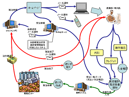 ごとに機能を追加できたり、仕様変更できたりするケースは稀である。そこで松屋ではこの適応度を見極めるために、こちらが想定するネットショップ業務の流れを全体業務プロセス図としてまとめた(図1)。