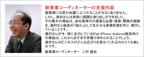 商品販売に関しては、様々な商材を開発し、トライ&エラーを繰り返しながら、現在はiPad、iPhone、Androidなどのタブレット型端末向けの商品に注力しております。年内に業務向けの商品を2つリリースする予定で、来年は関東、関西圏にも商圏を広げていく予定です。